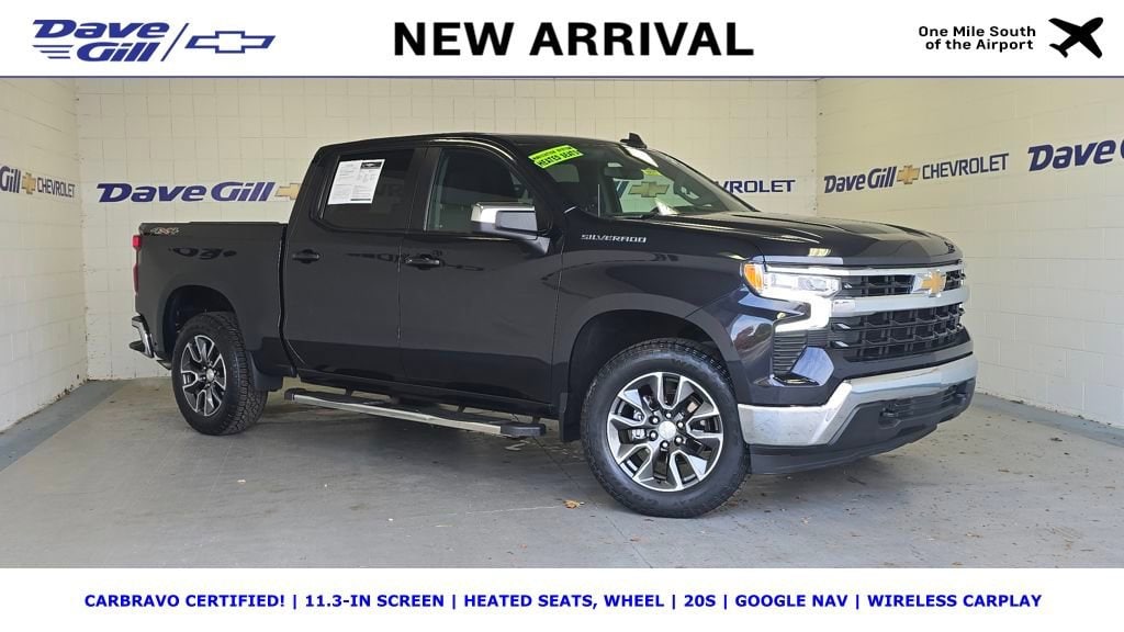 WHAT IS CARBRAVO? ALL CARBRAVO CERTIFIED USED VEHICLES INCLUDE A 6 MONTH, 6,000-MILE FACTORY BACKED NEAR BUMPER-TO-BUMPER WARRANTY THAT IS VALID NATIONWIDE! * GOOD NEWS: THIS VEHICLE MEETS THAT CARBRAVO STANDARD! * CARBRAVO CERTIFIED! * 11.3-IN SCREEN * HEATED SEATS, WHEEL * 20S * GOOGLE NAV * WIRELESS CARPLAY * 2022 Chevrolet Silverado 1500 LT 2.7L Turbo Dark Ash Metallic CarBravo Certified Used, OFF-LEASE VEHICLE!, Crew Cab, 8-Speed Automatic, 4WD, Jet Black w/Cloth Seat Trim, 10-Way Power Driver Seat w/Lumbar, 12.3 Multicolor Reconfigurable Digital Display, 120-Volt Instrument Panel Power Outlet, 40/20/40 Front Split-Bench Seat, 6-Speaker Audio System, All-Star Edition, AM/FM radio: SiriusXM with 360L, Apple CarPlay/Android Auto, Automatic Emergency Braking, Automatic temperature control, Chevrolet Connected Access Capable, Convenience Package, Dual Rear USB Ports (Charge Only), Dual-Zone Automatic Climate Control, Following Distance Indicator, Forward Collision Alert, Front dual zone A/C, Front Pedestrian Braking, Heated Driver & Front Outboard Passenger Seats, Heated Steering Wheel, Hitch Guidance, IntelliBeam Automatic High Beam On/Off, Keyless Open & Start, Lane Keep Assist w/Lane Departure Warning, Leather Wrapped Steering Wheel, Manual Tilt/Telescoping Steering Column, OnStar & Chevrolet Connected Services Capable, Premium audio system: Chevrolet Infotainment 3 Premium, Radio data system, Radio: Chevrolet Infotainment 3 Premium System, Rear 60/40 Folding Bench Seat (Folds Up), Remote Vehicle Starter System, SiriusXM w/360L, Standard Suspension Package, Steering Wheel Audio Controls, Trailering Package, Wheels: 20 x 9 Painted Aluminum, Wi-Fi Hot Spot Capable.Your peace of mind is important to us. We have included over 24 photos so that you can judge the condition of this vehicle yourself. As you do your comparison shopping, you will see Dave Gill Chevrolet offers some of the best values in the market for your hard-earned money. Our commitment to customer satisfaction is our number one priority, and we do not use high-pressure sales tactics. We inspect and service all our used cars as necessary; not simply take it to the local car wash and use their free vacuums. We will provide you a Carfax, vehicle inspection results, and how we arrived at the price. We may not always be the lowest, but if you want to know who is, we will show you that, too. Call or stop by Dave Gill Chevrolet at 4700 E. Broad Street in Columbus to schedule a test drive today. Serving the Greater Columbus Area. We are just minutes from Port Columbus Airport and offer free pick-up for our out-of-town guests.