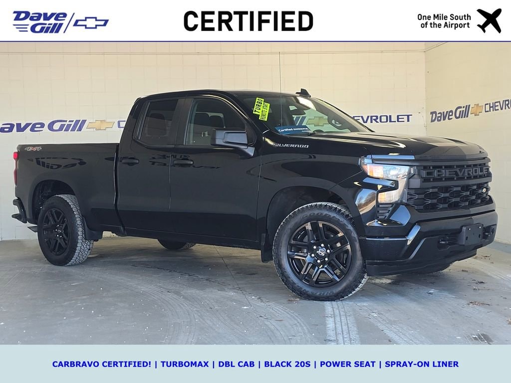 WHAT IS CARBRAVO? ALL CARBRAVO CERTIFIED USED VEHICLES INCLUDE A 12-MONTH, 12,000-MILE FACTORY BACKED NEAR BUMPER-TO-BUMPER WARRANTY THAT IS VALID NATIONWIDE! * GOOD NEWS: THIS VEHICLE MEETS THAT CARBRAVO STANDARD! * CARBRAVO CERTIFIED! * TURBOMAX * DBL CAB * BLACK 20S * REMOTE START * POWER SEAT * SPRAY-ON LINER * WIRELESS CARPLAY * 2022 Chevrolet Silverado 1500 Custom 2.7L Turbo Black CarBravo Certified Used, Double Cab, 8-Speed Automatic, 4WD, Jet Black, 10-Way Power Driver Seat w/Lumbar, 120-Volt Bed Mounted Power Outlet, 120-Volt Instrument Panel Power Outlet, 3.5 Monochromatic Display Driver Info Center, 40/20/40 Front Split-Bench Seat, 6-Speaker Audio System, AM/FM radio: SiriusXM, Apple CarPlay/Android Auto, Automatic Emergency Braking, Bluetooth® For Phone, Chevytec Spray-On Black Bedliner, Color-Keyed Carpeting Floor Covering, Compass, Custom Convenience Package, Custom Value Package, Deep-Tinted Glass, Dual Rear USB Ports (Charge Only), Electric Rear-Window Defogger, Electrical Steering Column Lock, Electronic Cruise Control, EZ Lift Power Lock & Release Tailgate, Following Distance Indicator, Forward Collision Alert, Front Frame-Mounted Black Recovery Hooks, Front Pedestrian Braking, Front Rubberized Vinyl Floor Mats, HD Rear Vision Camera, Lane Keep Assist w/Lane Departure Warning, LED Cargo Area Lighting, Manual Tilt Wheel Steering Column, OnStar & Chevrolet Connected Services Capable, Power Front Windows w/Driver Express Up/Down, Power Front Windows w/Passenger Express Down, Power Rear Windows w/Express Down, Preferred Equipment Group 1CX, Radio data system, Radio: Chevrolet Infotainment 3 System, Rear 60/40 Folding Bench Seat (Folds Up), Rear Rubberized-Vinyl Floor Mats, Remote Keyless Entry, Remote Vehicle Starter System, SiriusXM Radio, Standard Tailgate, Theft Deterrent System (Unauthorized Entry), Trailering Package, Wheels: 20 x 9 High Gloss Black Painted Alum, Wireless Phone Projection.