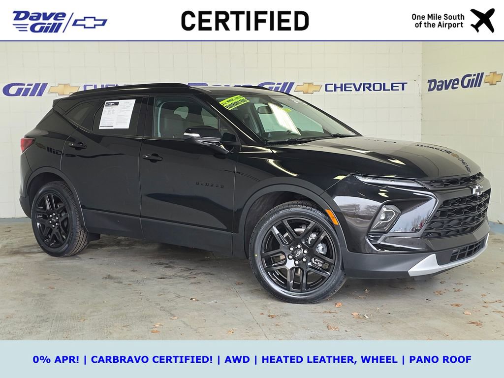 WHAT IS CARBRAVO? ALL CARBRAVO CERTIFIED USED VEHICLES INCLUDE A 12-MONTH, 12,000-MILE FACTORY BACKED NEAR BUMPER-TO-BUMPER WARRANTY THAT IS VALID NATIONWIDE! * GOOD NEWS: THIS VEHICLE MEETS THAT CARBRAVO STANDARD! * CARBRAVO CERTIFIED! * AWD * HEATED LEATHER SEATING, WHEEL * PANO ROOF * BLACK 20S, GRILLE, BADGING * REMOTE START * BLIND ZONE ALERT * NEW TIRES! * 2023 Chevrolet Blazer LT 2.0L Turbocharged Black CarBravo Certified Used, OFF-LEASE VEHICLE!, ONE OWNER!, CHECK THE CARFAX -- WELL MAINTAINED!, CLEAN VEHICLE HISTORY REPORT!, AWD, 6-Speaker Audio System Feature, 6-Way Power Front Passenger Seat Adjuster, 8-Way Power Driver Seat Adjuster, AM/FM radio: SiriusXM with 360L, Apple CarPlay/Android Auto, Automatic temperature control, Black Grille Bar LPO), Black Grille Bar Package (LPO), Black Roof-Mounted Side Rails, Driver Confidence Package, Front & Rear Black Bowties, Front dual zone A/C, Heated Driver & Front Passenger Seats, Inside Rear-View Auto-Dimming Mirror, Interior Protection Package (LPO), Lane Change Alert w/Side Blind Zone Alert, Outside Heated Power-Adjustable Body-Color Mirrors, Perforated Leather-Appointed Seat Trim, Power Panoramic Tilt-Sliding Sunroof, Preferred Equipment Group 3LT, Premium All-Weather Cargo Mat (LPO), Premium All-Weather Floor Mats, Premium audio system: Chevrolet Infotainment 3 Plus, Radio data system, Radio: Chevrolet Infotainment 3 Plus System, Rear Cross Traffic Alert, Rear Park Assist w/Audible Warning, Rear Power Programmable Liftgate, SiriusXM w/360L, Speed control, Universal Home Remote, Wheels: 20 Gloss Black Aluminum.