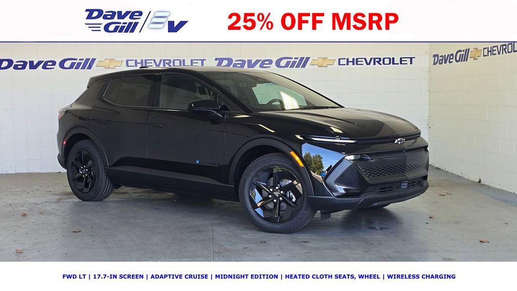FWD LT * 17.7-IN SCREEN * ADAPTIVE CRUISE * MIDNIGHT EDITION * HEATED CLOTH SEATS, WHEEL * WIRELESS CHARGING * 2026 Equinox EV LT 4D Sport Utility Black Electric Drive Unit FWD 6-Speaker Audio System Feature, 8-Way Power Driver Seat Adjuster, Active Cruise Control, Active Safety Package 2, All-Weather Cargo Area Liner (LPO), All-Weather Liner Package (LPO), AM/FM radio: SiriusXM with 360L, Cloth Seat Trim, Comfort Package, Contoured All-Weather Floor Liner (LPO), Enhanced Traffic Sign Recognition, HD Surround Vision, Heated Automatic Steering Wheel, Heated Driver & Fr Passenger Seats Cushion & Seatback, LT 1 Package, Midnight Package, NACS DC Adapter (LPO), Navigation system: Google built-in compatibility (select service plan required, terms and limitations apply), Painted Mirror Caps, Power Driver Lumbar Control, Preferred Equipment Group 2LT, Radio: 17.7 Diagonal Advanced Color LCD Display, Rear Pedestrian Alert, Round Bottom Wrapped Steering Wheel, SiriusXM w/360L Trial Subscription, Wheels: 19 Black Painted Aluminum. All pricing is plus tax, license & fees. New vehicle pricing and incentives are for purchases only and do not apply to leases. Moreover, all financing offers, including 0% programs, are w/ approved credit and are NOT compatible with most purchase rebates. Information on this site includes 3rd party data believed to be reliable, subject to change without notice. It is your responsibility to confirm any data prior to purchase. Many of our vehicles already have accessories installed that ARE NOT reflected in our Internet pricing.