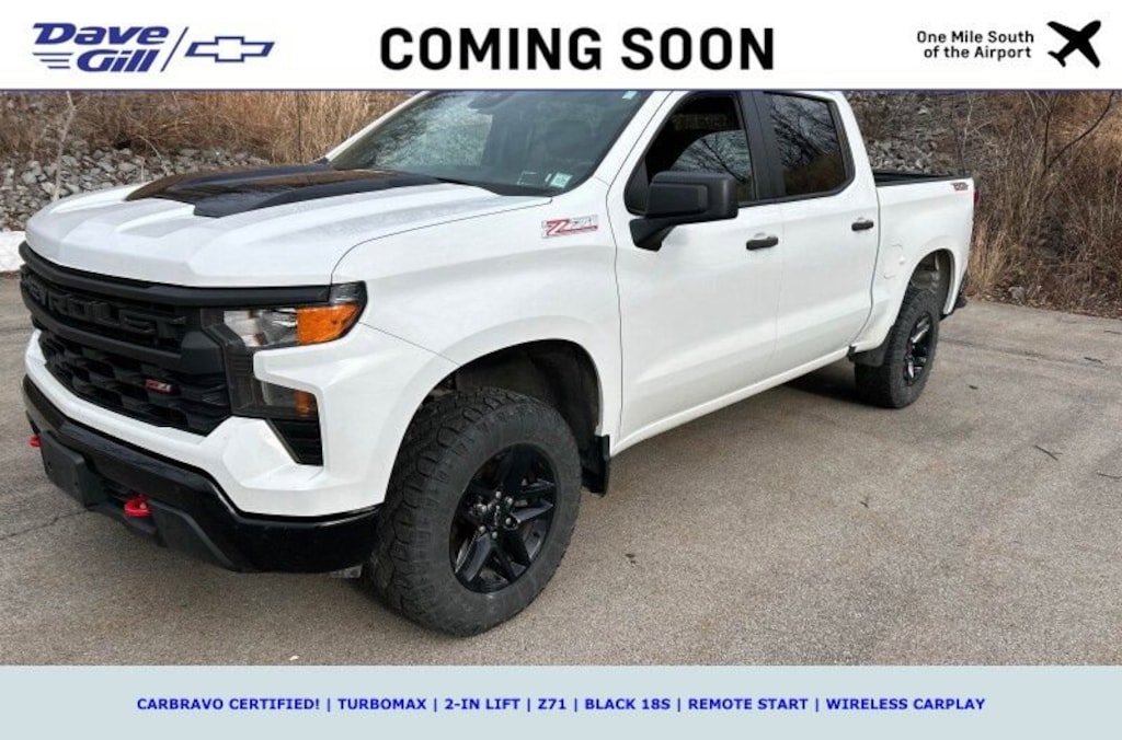 WHAT IS CARBRAVO? ALL CARBRAVO CERTIFIED USED VEHICLES INCLUDE A 12-MONTH, 12,000-MILE FACTORY BACKED NEAR BUMPER-TO-BUMPER WARRANTY THAT IS VALID NATIONWIDE! * GOOD NEWS: THIS VEHICLE MEETS THAT CARBRAVO STANDARD! * CARBRAVO CERTIFIED! * OFF-LEASE RIDE * TURBOMAX * FACTORY 2-IN LIFT * Z71 * BLACK 18S * REMOTE START * POWER DRIVER SEAT * LANE KEEP ASSIST * WIRELESS CARPLAY * 2022 Chevrolet Silverado 1500 Custom Trail Boss 2.7L Turbo Summit White CarBravo Certified Used, OFF-LEASE VEHICLE!, Z71, Crew Cab, ONE OWNER!, CLEAN CARFAX!, 8-Speed Automatic, 4WD, Jet Black w/Cloth Seat Trim, 10-Way Power Driver Seat w/Lumbar, 120-Volt Bed Mounted Power Outlet, 120-Volt Instrument Panel Power Outlet, 3.5 Monochromatic Display Driver Info Center, 40/20/40 Front Split-Bench Seat, 6-Speaker Audio System, AM/FM radio: SiriusXM, Apple CarPlay/Android Auto, Auto-Locking Rear Differential, Automatic Emergency Braking, Bluetooth® For Phone, Color-Keyed Carpeting Floor Covering, Compass, Custom Convenience Package, Deep-Tinted Glass, Dual Rear USB Ports (Charge Only), Electric Rear-Window Defogger, Electrical Steering Column Lock, Electronic Cruise Control, EZ Lift Power Lock & Release Tailgate, Following Distance Indicator, Forward Collision Alert, Front Pedestrian Braking, Front Rubberized Vinyl Floor Mats, HD Rear Vision Camera, Heavy-Duty Air Filter, Hill Descent Control, Lane Keep Assist w/Lane Departure Warning, LED Cargo Area Lighting, Manual Tilt Wheel Steering Column, OnStar & Chevrolet Connected Services Capable, Performance Red Recovery Hooks, Power Front Windows w/Driver Express Up/Down, Power Front Windows w/Passenger Express Down, Power Rear Windows w/Express Down, Preferred Equipment Group 2CX, Radio data system, Radio: Chevrolet Infotainment 3 System, Rear 60/40 Folding Bench Seat (Folds Up), Rear Rubberized-Vinyl Floor Mats, Remote Keyless Entry, Remote Vehicle Starter System, SiriusXM Radio, Standard Tailgate, Suspension Package, Theft Deterrent System (Unauthorized Entry), Trailering Package, Wheels: 18 x 8.5 Black Painted Aluminum, Wireless Phone Projection.Your peace of mind is important to us. We have included over 24 photos so that you can judge the condition of this vehicle yourself. As you do your comparison shopping, you will see Dave Gill Chevrolet offers some of the best values in the market for your hard-earned money. Our commitment to customer satisfaction is our number one priority, and we do not use high-pressure sales tactics. We inspect and service all our used cars as necessary; not simply take it to the local car wash and use their free vacuums. We will provide you a Carfax, vehicle inspection results, and how we arrived at the price. We may not always be the lowest, but if you want to know who is, we will show you that, too. Call or stop by Dave Gill Chevrolet at 4700 E. Broad Street in Columbus to schedule a test drive today. Serving the Greater Columbus Area. We are just minutes from Port Columbus Airport and offer free pick-up for our out-of-town guests.