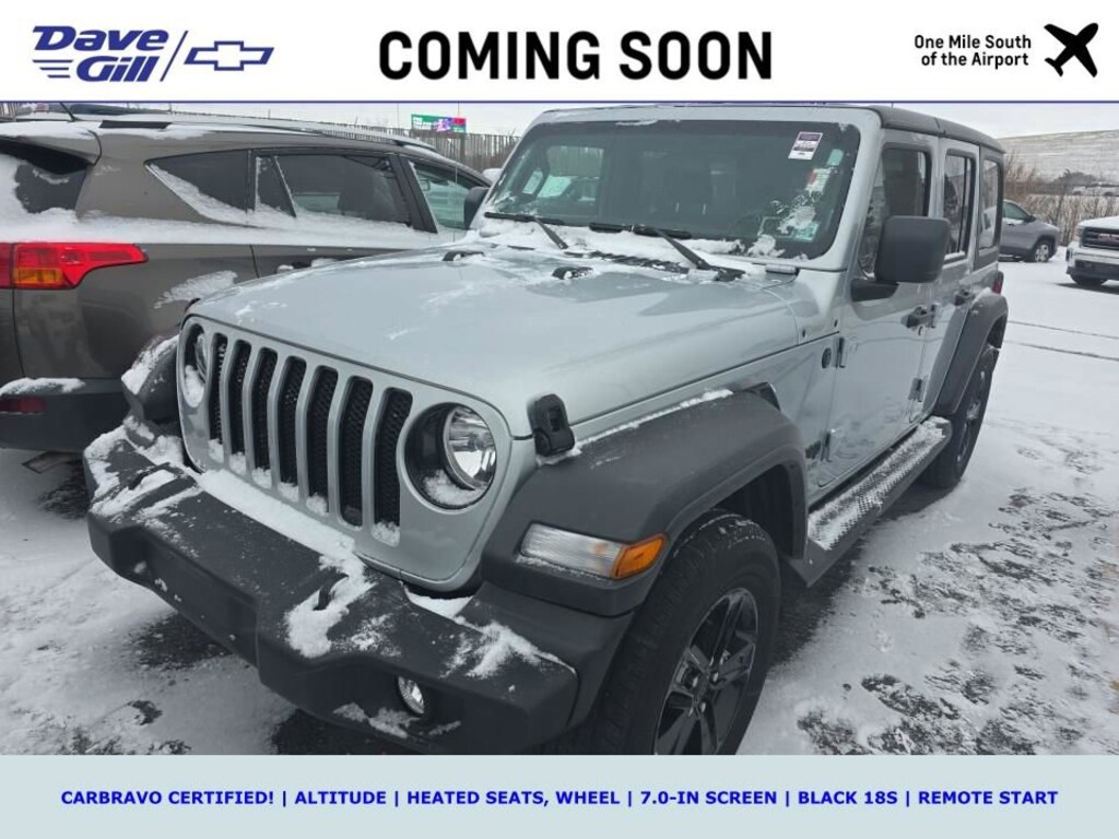 WHAT IS CARBRAVO? ALL CARBRAVO CERTIFIED USED VEHICLES INCLUDE A 12-MONTH, 12,000-MILE FACTORY BACKED NEAR BUMPER-TO-BUMPER WARRANTY THAT IS VALID NATIONWIDE! * GOOD NEWS: THIS VEHICLE MEETS THAT CARBRAVO STANDARD! * CARBRAVO CERTIFIED! * ALTITUDE EDITION * HEATED CLOTH SEATS, WHEEL * 7.0-IN UCONNECT * BLACK 18S * REMOTE START * ANDROID AUTO * 2022 Jeep Wrangler Unlimited Sport Altitude 2.0L I4 DOHC Silver Zynith Clearcoat CarBravo Certified Used, OFF-LEASE VEHICLE!, ONE OWNER!, CLEAN CARFAX!, 110 MPH Vehicle Max Speed Calibration, 2-Door Passive Entry, Front Door Locks, 8 Speakers, Air Conditioning w/Auto Temperature Control, Air Filtering, Altitude Package, AM/FM radio, Apple CarPlay/Android Auto, Automatic Headlamps, Black 3-Piece Hard Top, Black Interior Accents, Black Trail Rated Badge, Body Color Grille w/Gloss Black Rings, Cloth Low-Back Bucket Seats, Cluster 7.0 TFT Color Display, Cold Weather Group, Convenience Group, Deep Tint Sunscreen Windows, Front 1-Touch Down Power Windows, Heated Front Seats, Heated Steering Wheel, Heavy Duty Suspension w/Gas Shocks, Leather Wrapped Steering Wheel, Matte Black Jeep Badge, MOPAR Hardtop Headliner, ParkView Rear Back-Up Camera, Power Heated Mirrors, Quick Order Package 22L Altitude, Radio data system, Radio: Uconnect 4 w/7 Display, Remote Keyless Entry, Remote Start System, Security Alarm, SiriusXM Satellite Radio, Speed Sensitive Power Locks, Stop-Start Dual Battery System, Sun Visors w/Illuminated Vanity Mirrors, Technology Group, Universal Garage Door Opener, Wheels: 18 x 7.5 Gloss Black Aluminum, Wizard Black Instrument Panel Bezels.